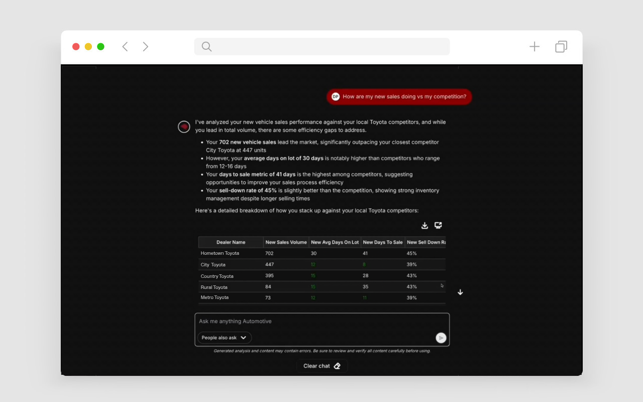 Pulls live data from your inventory, CRM, and Google Analytics — plus Lotlinx’s dataset — to provide relevant and accurate answers.