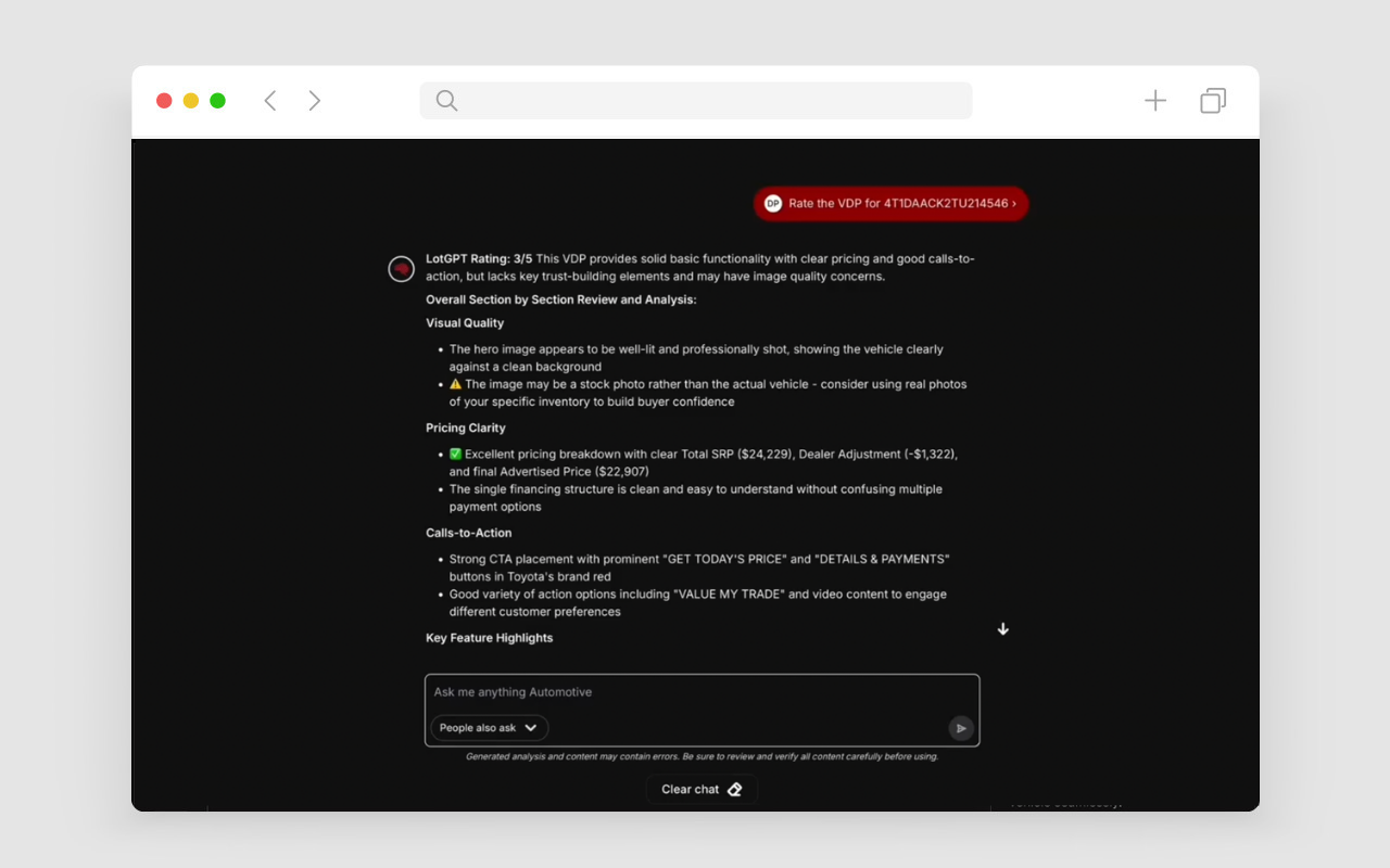 LotGPT analyzes your vehicle listings to identify opportunities to elevate your merchandising, so every vehicle shines online — from upgrading vehicle photos to rewriting vehicle descriptions.