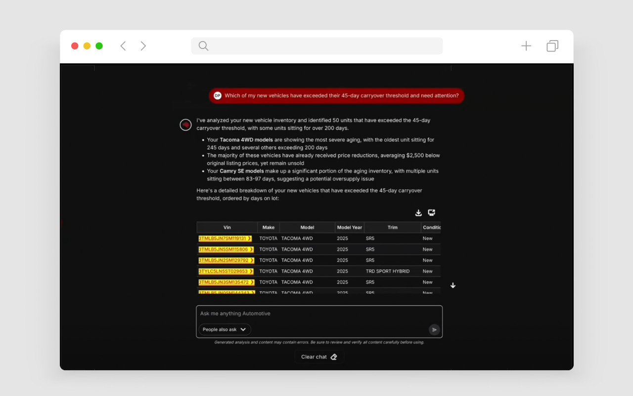 Make data-driven decisions. LotGPT analyzes your live inventory alongside real-time market supply and shopper demand, then delivers clear, VIN-level recommendations—whether it’s optimize pricing, boost visibility, or improve merchandising.