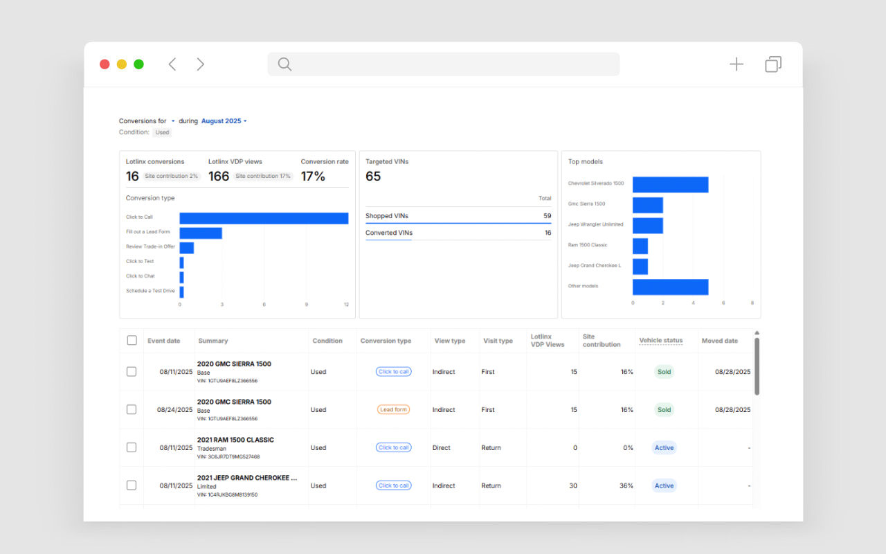 VIN Manager gives Lotlinx campaign clients a clear view of performance — making it easy to see how your campaigns are driving key outcomes like conversion, days to sale, sales and gross profit.