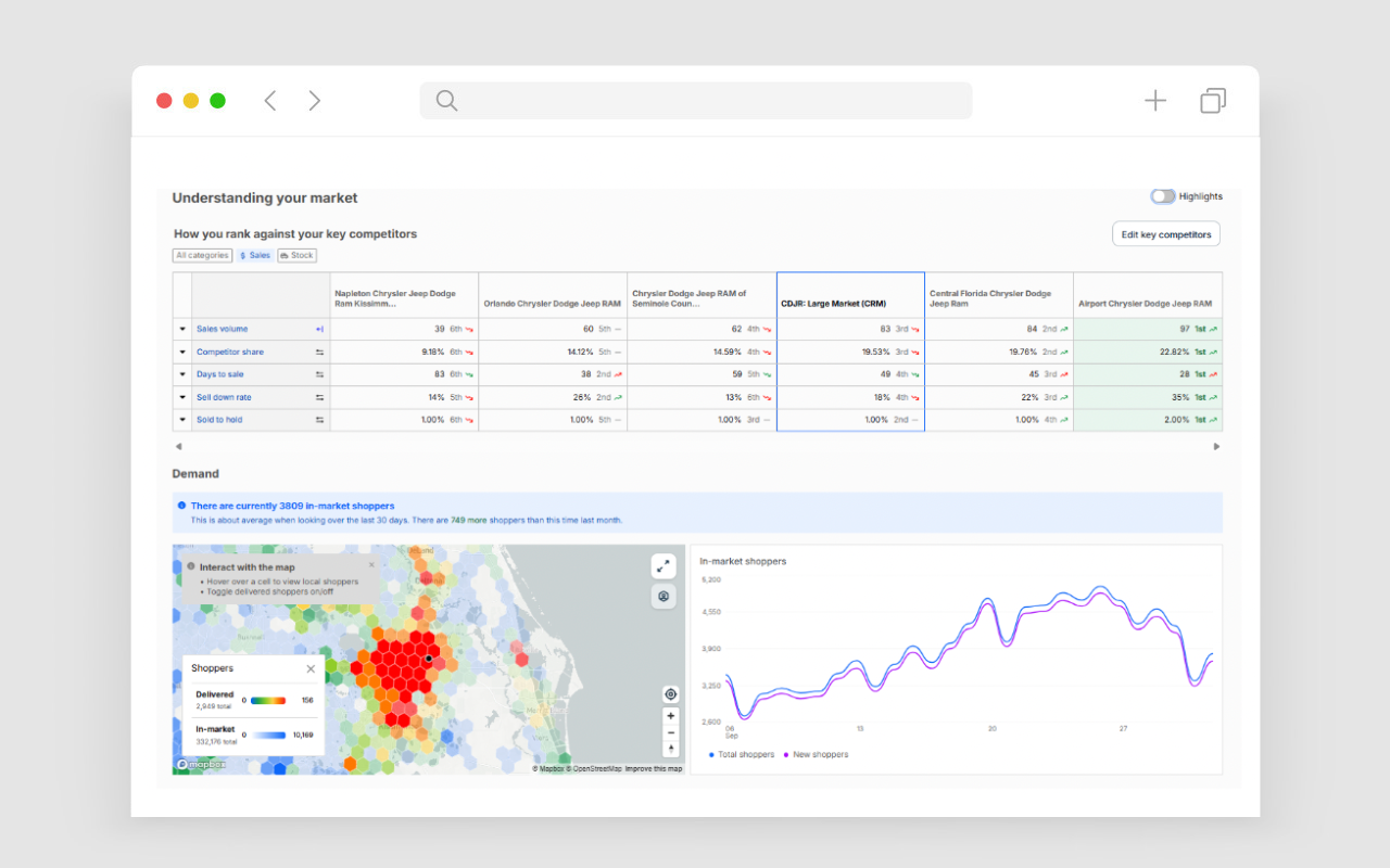 VIN Manager delivers competitive insights that show how you stack up on key performance metrics. It also maps shopper demand, helping you find new opportunities and refine your targeting strategy for greater impact.